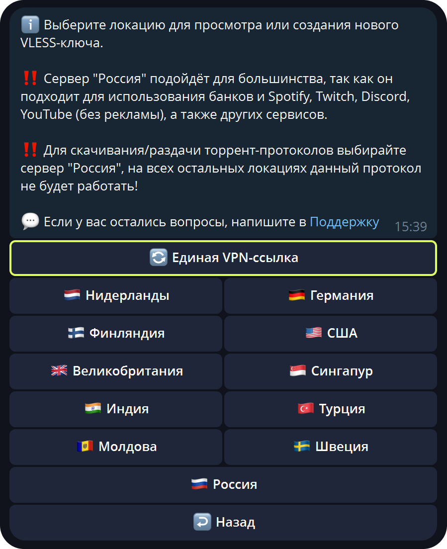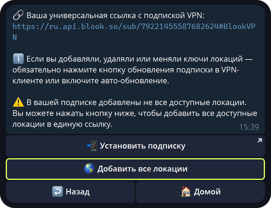 - После этого действия бот вам отправит сообщение с единой VPN-ссылкой, внутри которой у вас будут добавлены все локации.