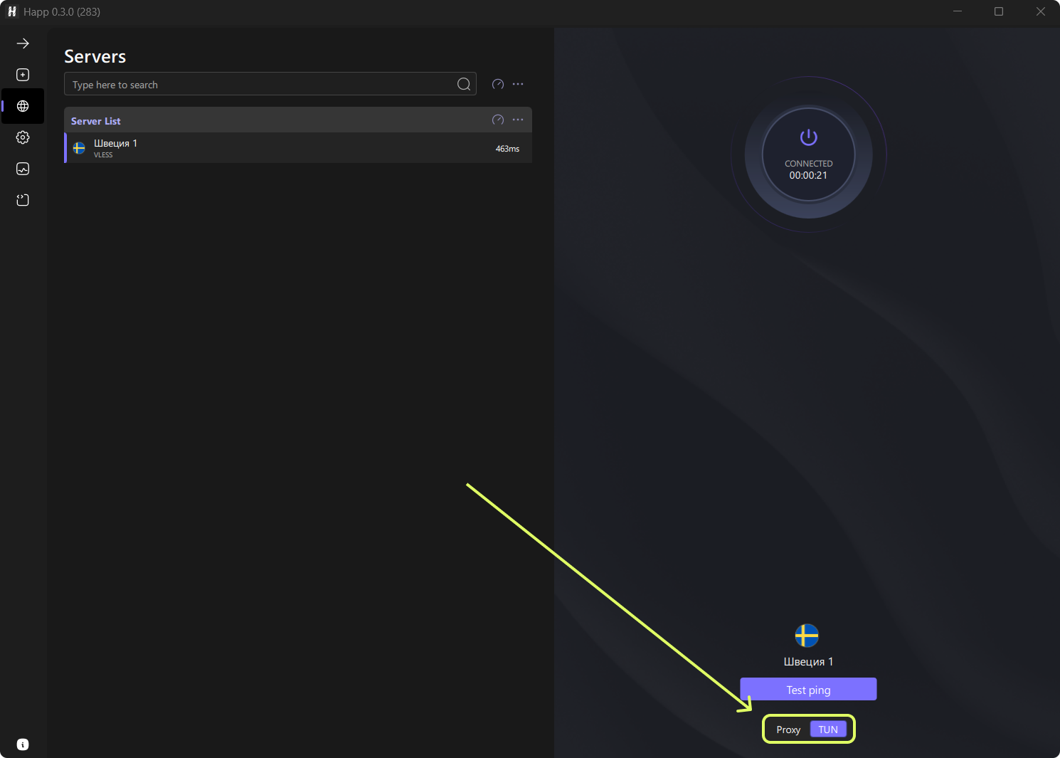 - [ПК]: Убедитесь, что у вас включен режим "TUN":